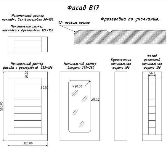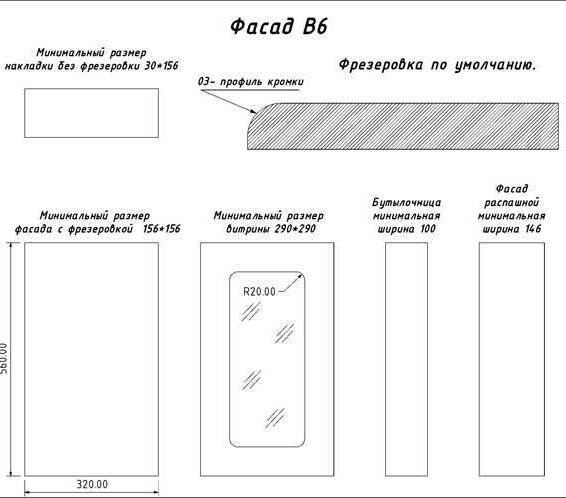 Обратите внимание, что форма радиусного фасада может изменяться! Указанные размеры являются ориентировочными. Рекомендуем изготавливать элементы корпуса и полки в соответствии с размерами конкретного радиусного фасада.