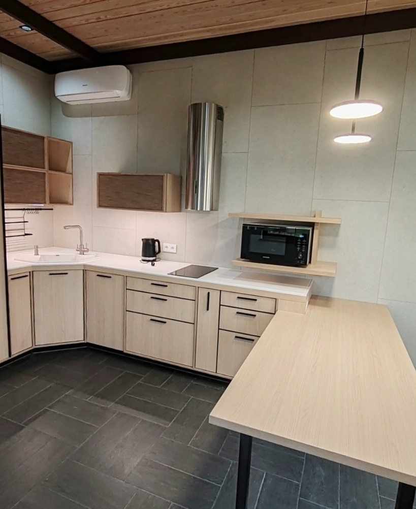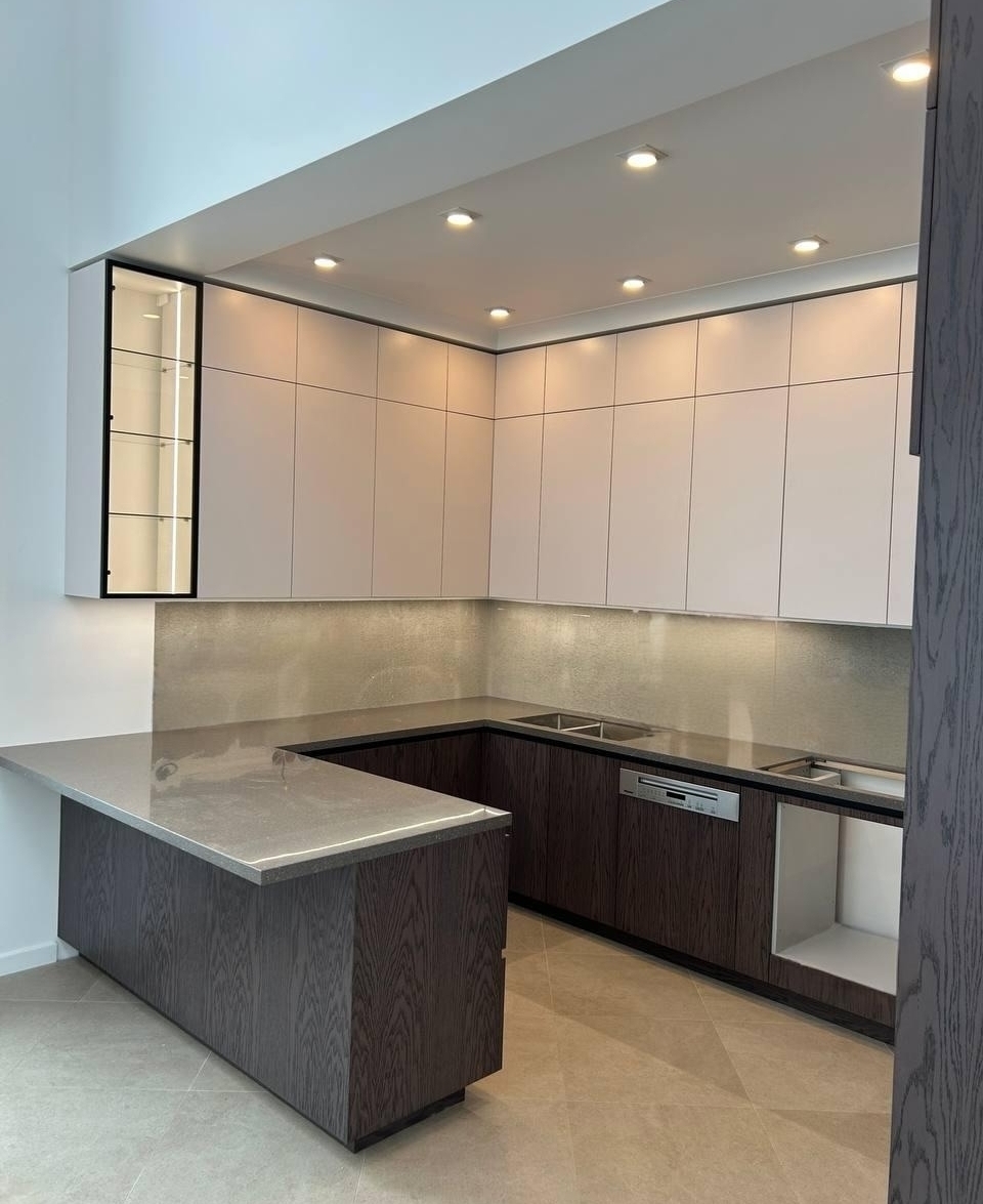 Кухня с потолочной панелью из шпона с подсветкой.
