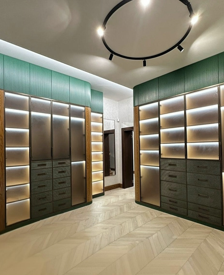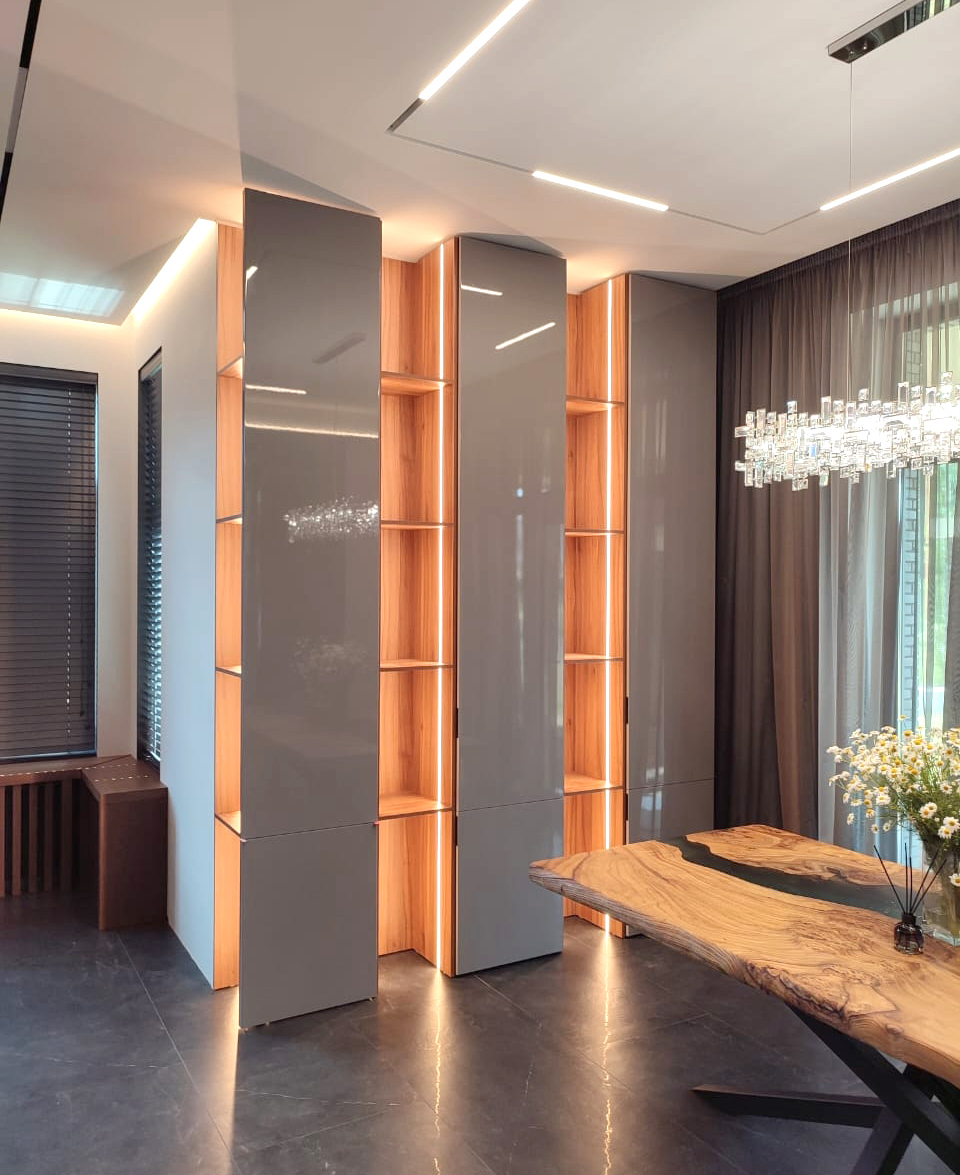 Стеклянная витрина с подсветкой зоны столовой.