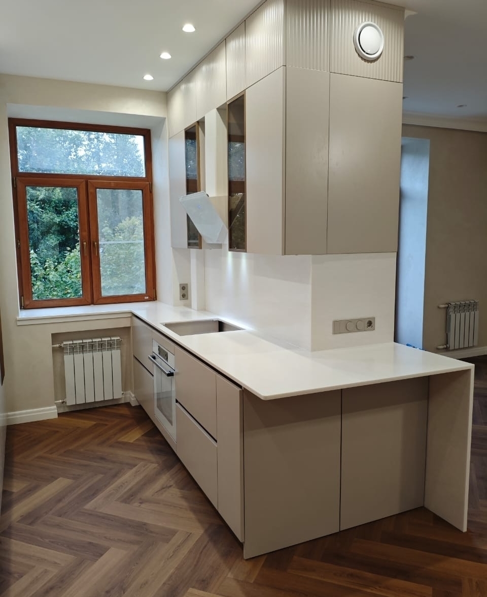 Компактаная кухня с фасадами из мдф под эмалью.